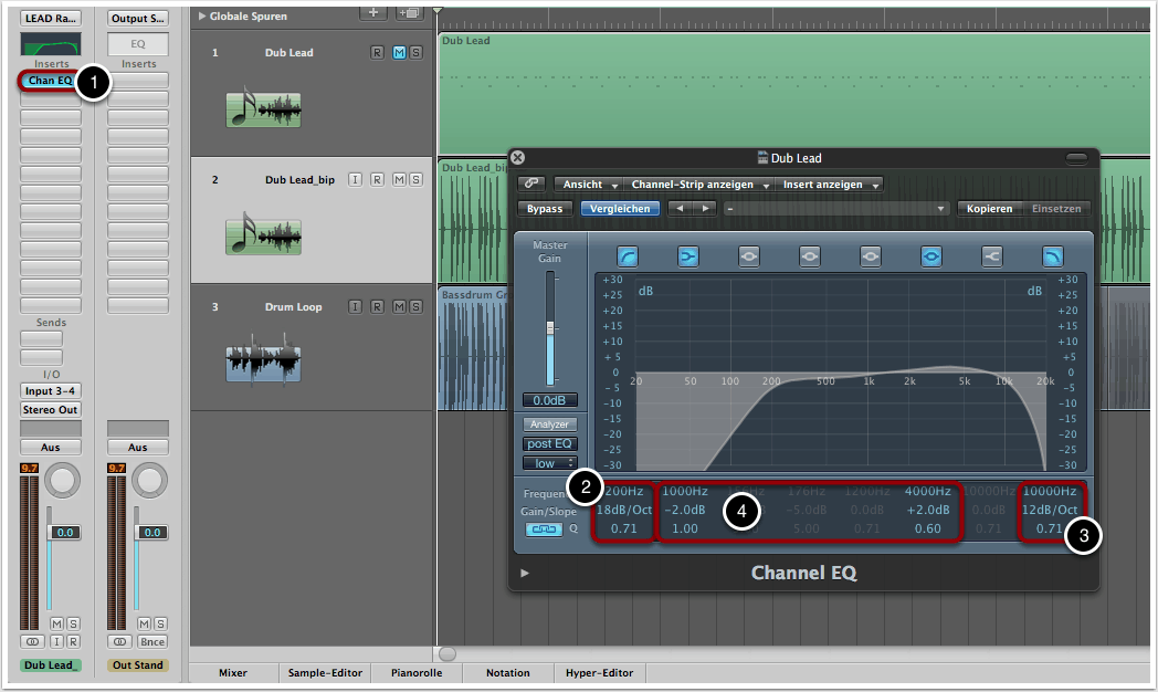 Zusätzlich heben wir noch ein wenig die Höhen um 4000Hz an und senken gleichzeitig die Mitten um 1000Hz ab (4).