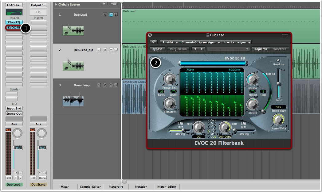 Als zweiten Effekt wählen wir “EVOC 20 Filterbank” aus (1).