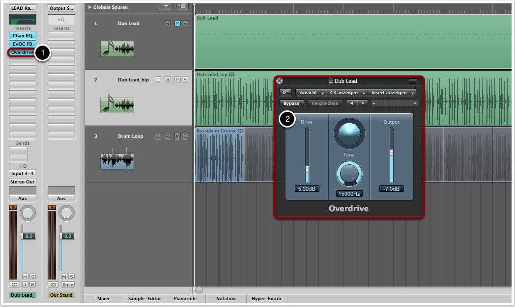 Als weiteren Effekt wählen wir “Overdrive” aus. Alternativ kann auch ein anderer Distortion-Effekt gewählt werden – je nach Geschmack. Unser Bass Sound wird dadurch etwas giftiger und aggressiver (1).