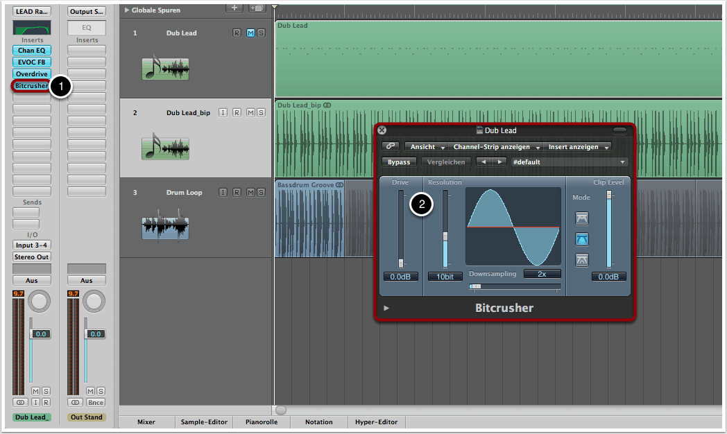 Mit “Bitcrusher” entscheiden wir uns für einen zweiten Distortion-Effekt (1).