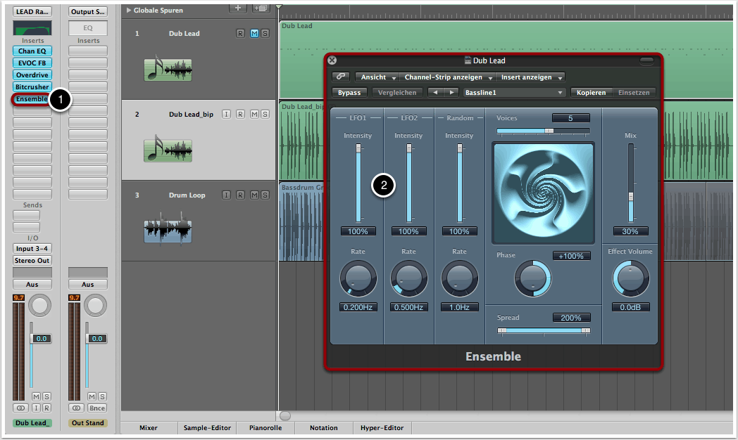 Als nächsten Effekt wählen wir “Ensemble” aus, wodurch wir den Klang im Stereopanorama verbreitern und leicht modulieren (1).