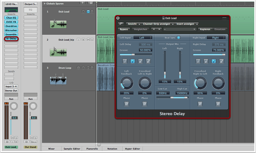 Zum Abschluss verwenden wir noch zwei Raumeffekte: Wir wählen zunächst “Stereo Delay” aus und übertragen die Werte aus der Abbildung.