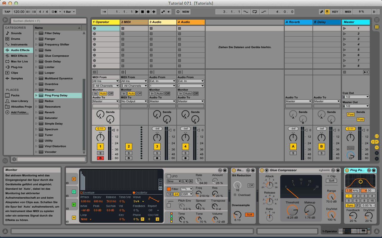 Nachdem wir in Tutorial 071 mit Ableton Lives Operator die Ausgangsbasis für einen FM House Bass geschaffen haben, wollen in diesem Tutorial eine Performance einspielen und den Klang durch eine Reihe von Effekten aufpeppen. Wir verwenden dafür ausschließlich integrierte Effekte von Ableton Live.