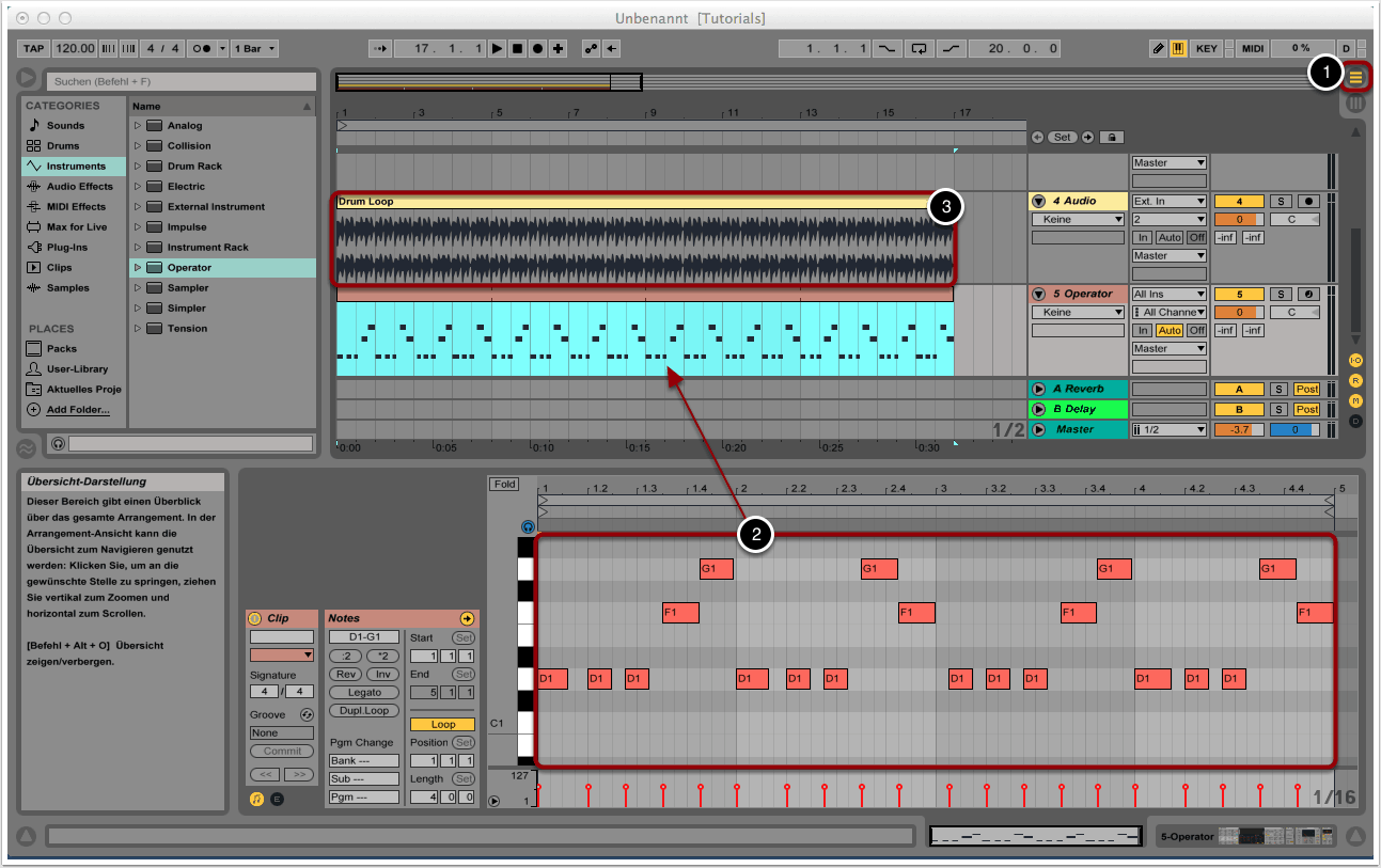 Um Effekte anzuwenden, wechseln wir zurück zur Session-Ansicht und wählen den Operator aus (1).