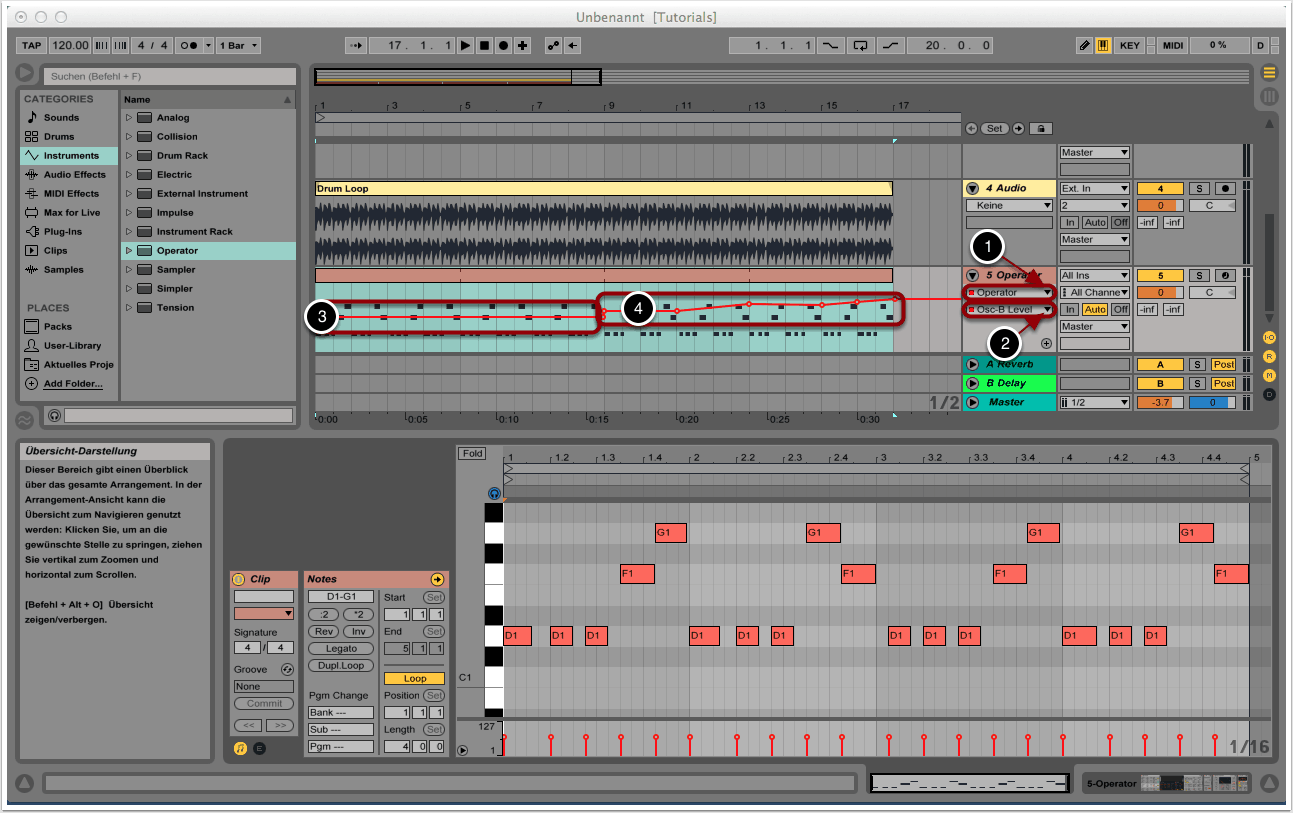 Aus dem Geräte-Menü der Instrumentenspur, in der sich der Operator befindet, wählen wir “Operator” aus (1).