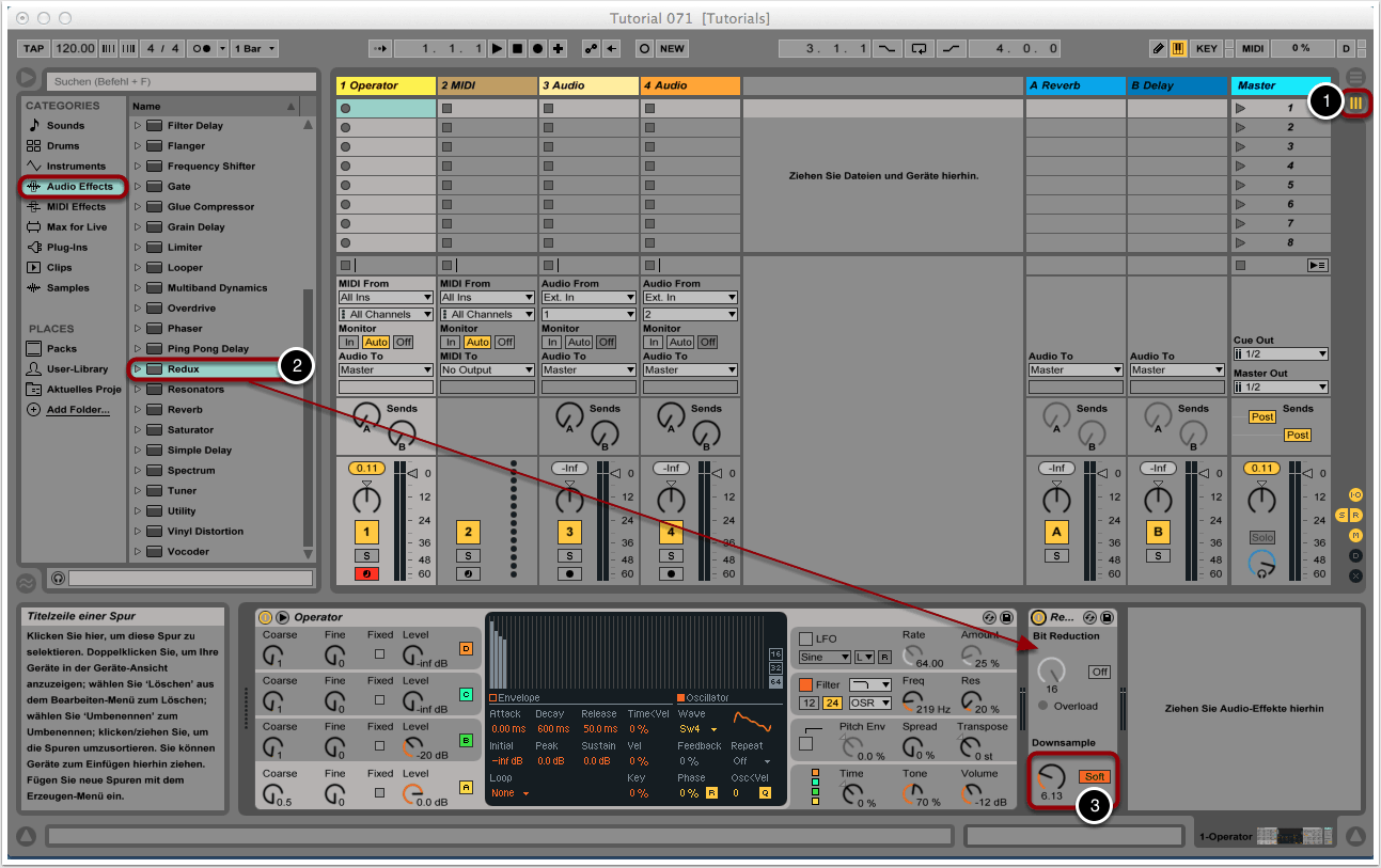 Wir begeben uns in das Effects-Menü, wählen “Redux” als ersten Effekt aus und ziehen das Modul per Drag&Drop direkt neben den Operator (2).