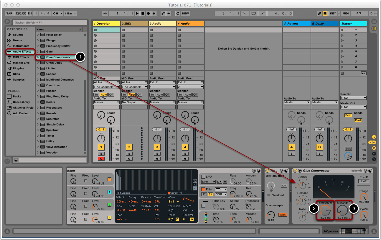 Als nächsten Effekt wählen wir “Glue Compressor” aus (1).