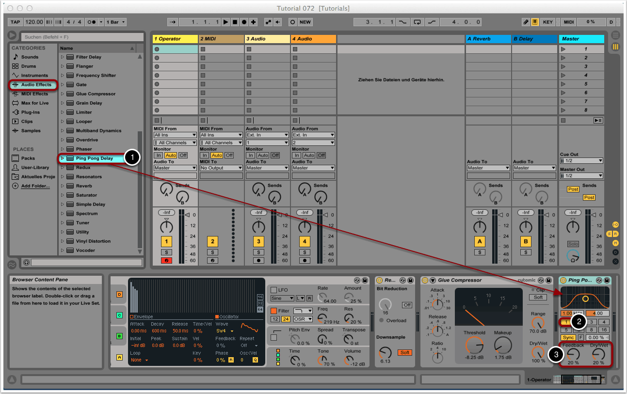 Das Feedback und das Dry-/Wet-Verhältnis reduzieren wir jeweils auf 20% (3).