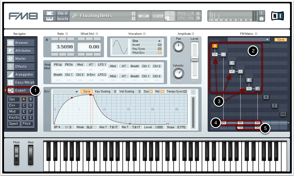 Die drei Werte “55” am unteren Ende der FM-Matrix bewirken, dass lediglich die Oszillatoren B, D und F mit einer Lautstärke von 55% zum Output gesendet und wiedergegeben werden (4). Die anderen Oszillatoren werden hingegen nicht direkt wiedergegeben, sondern fungieren lediglich als Frequenzmodulatoren.