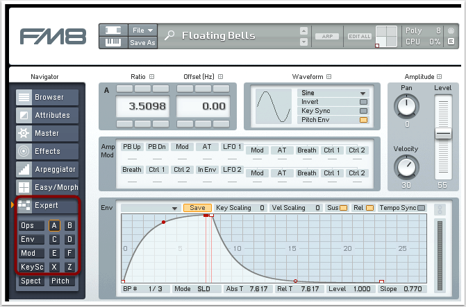 Über die Buchstaben auf der linken Seite können wir im Expert-Menü die Hüllkurve, die Wellenform und weitere Eigenschaften der Oszillatoren bestimmen. Wir klicken auf das Feld A und stellen die Parameter entsprechend der Abbildung ein. Analog verfahren wir auch mit den Oszillatoren B, C und D. Die Volume-Hüllkurven für die Oszillatoren A, B, C, D und F sind identisch; lediglich Oszillator E verfügt über eine leicht abweichende Envelope.