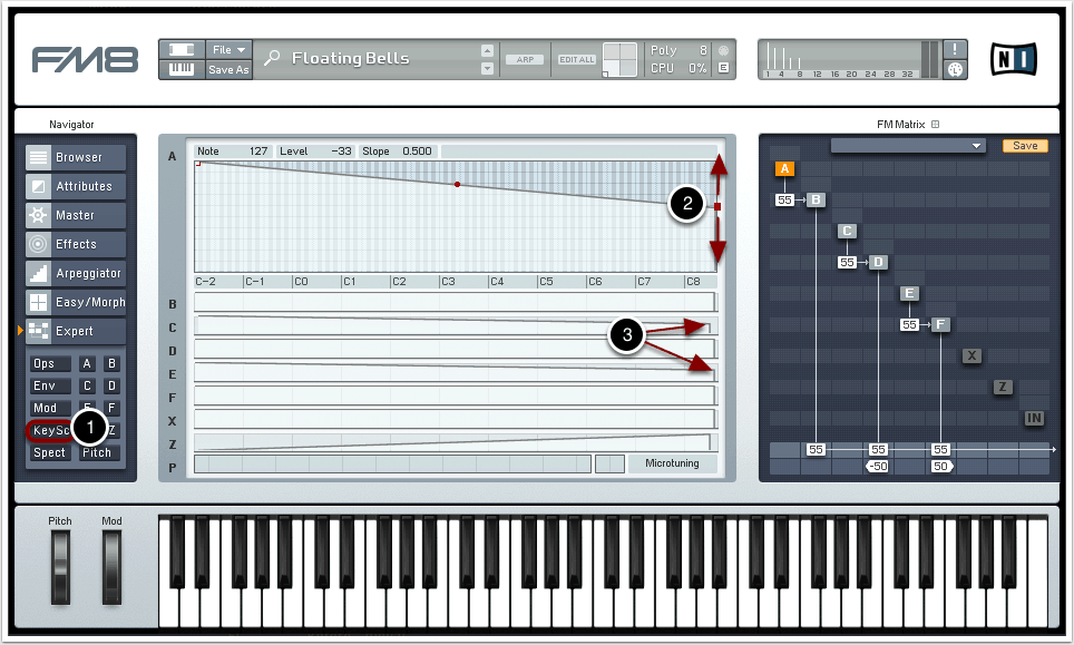 Abschließend wollen die Volume der verschiedenen Oszillatoren in Relation zur Tonhöhe bringen. Wir begeben uns hierzu in das Key-Scale-Menü (1).