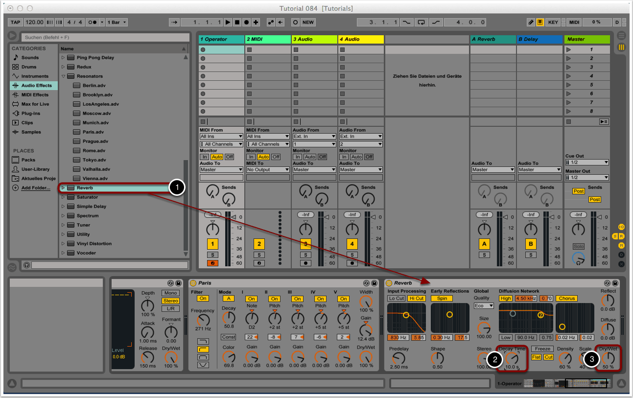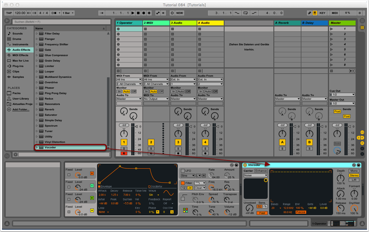In Tutorial 083 haben wir einen simplen Patch mit Ableton Lives Operator erstellt und dadurch die Ausgangsbasis für atmosphärische Pads und Klangtexturen geschaffen. In diesem Tutorial wollen wir den Patch durch eine Reihe von Effekten drastisch verfremden und schließlich in unseren Zielklang verwandeln. Wir verwenden dafür ausschließlich integrierte Effekte von Ableton Live.