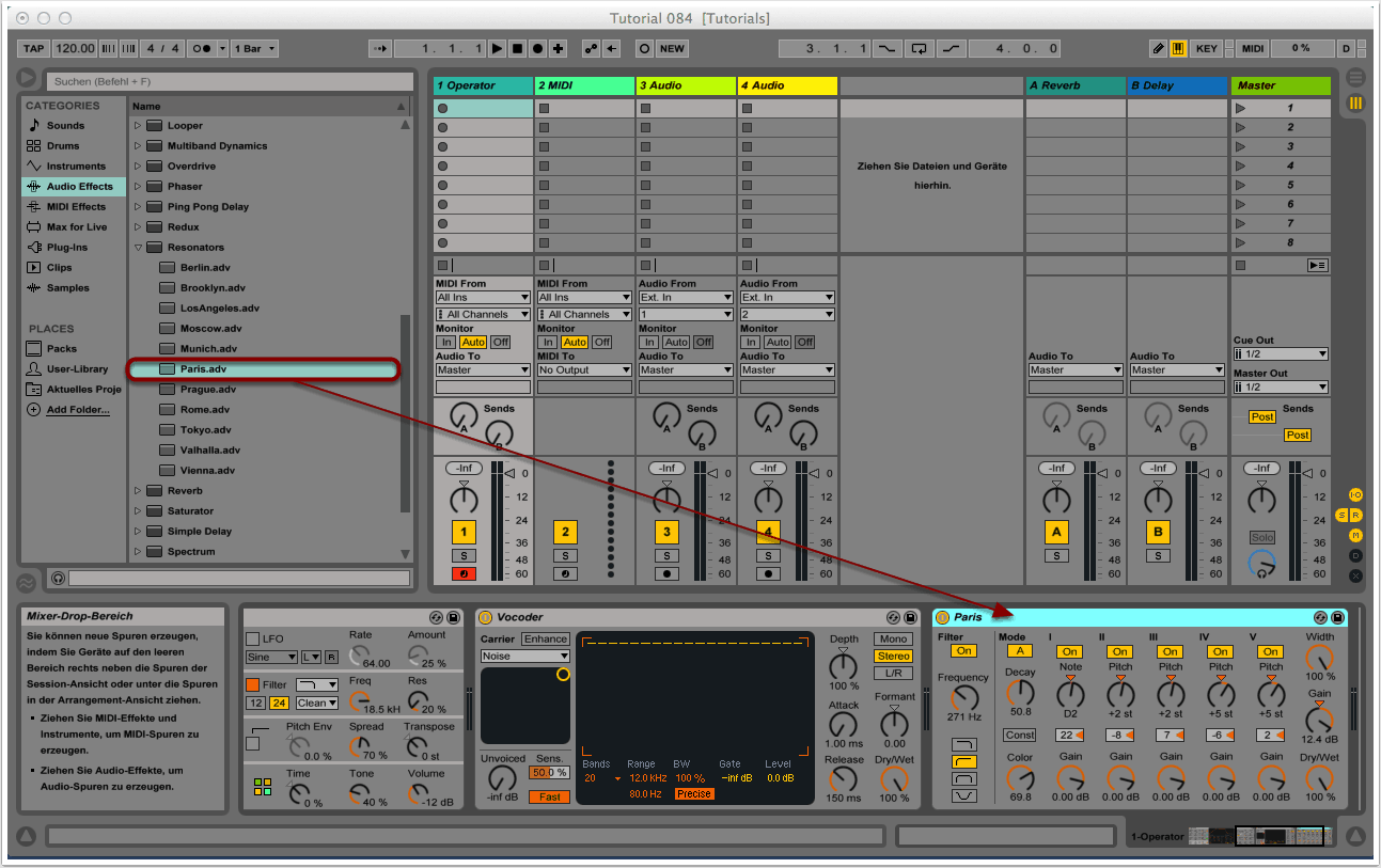 Durch die Anwendung von “Resonators” verleihen wir unseren Texturen einen harmonischen Charakter. Wir wählen das Preset “Paris” aus und ziehen das Modul rechts neben den Vocoder.