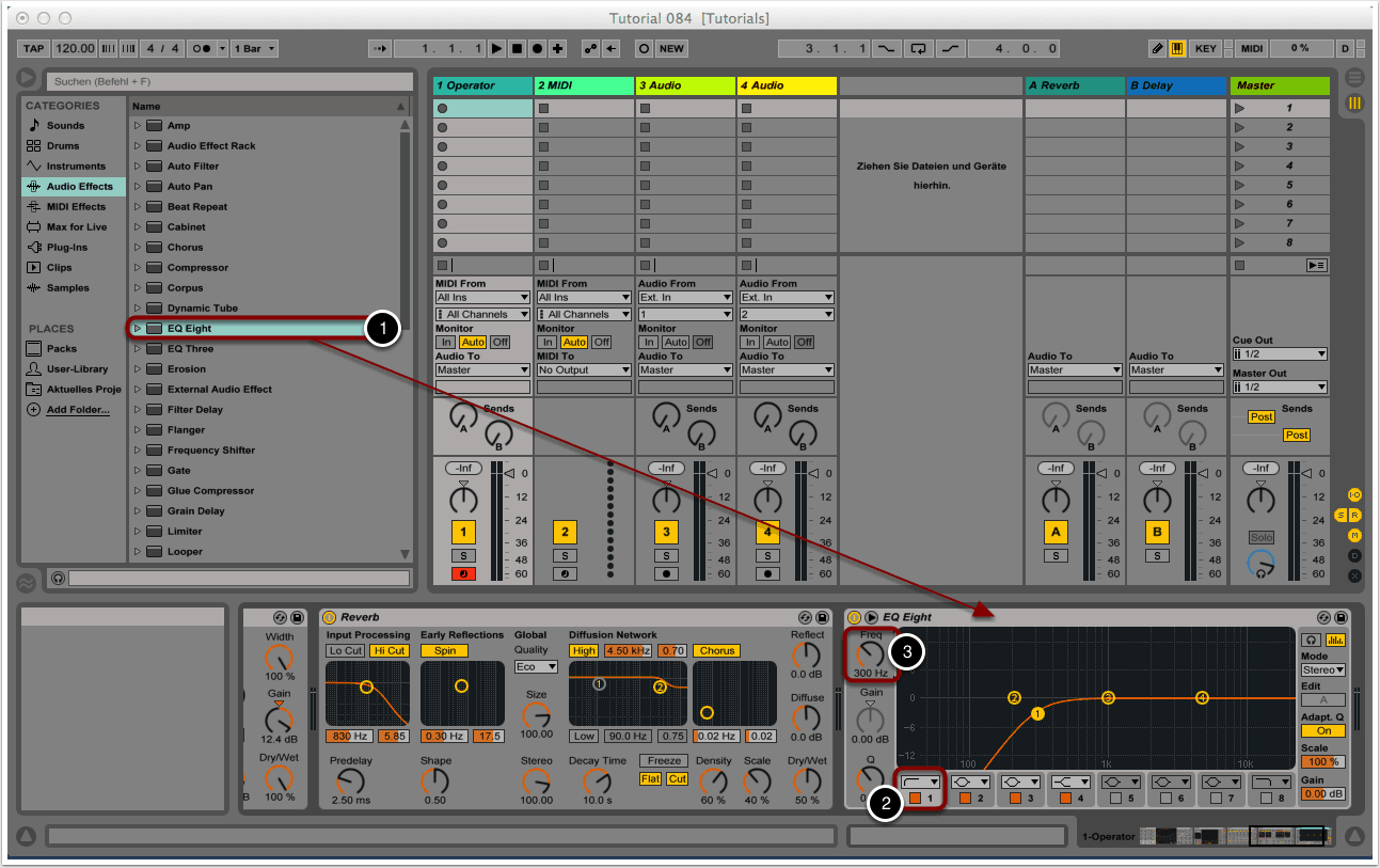 Abschließend wollen wir durch einen Equalizer die tieferen Frequenzanteile bändigen. Wir wählen “EQ Eight” aus und ziehen das Modul neben den Reverb (1).