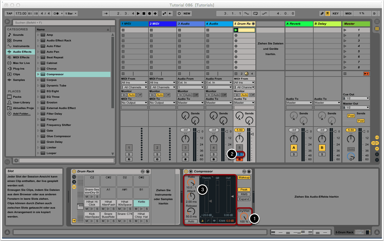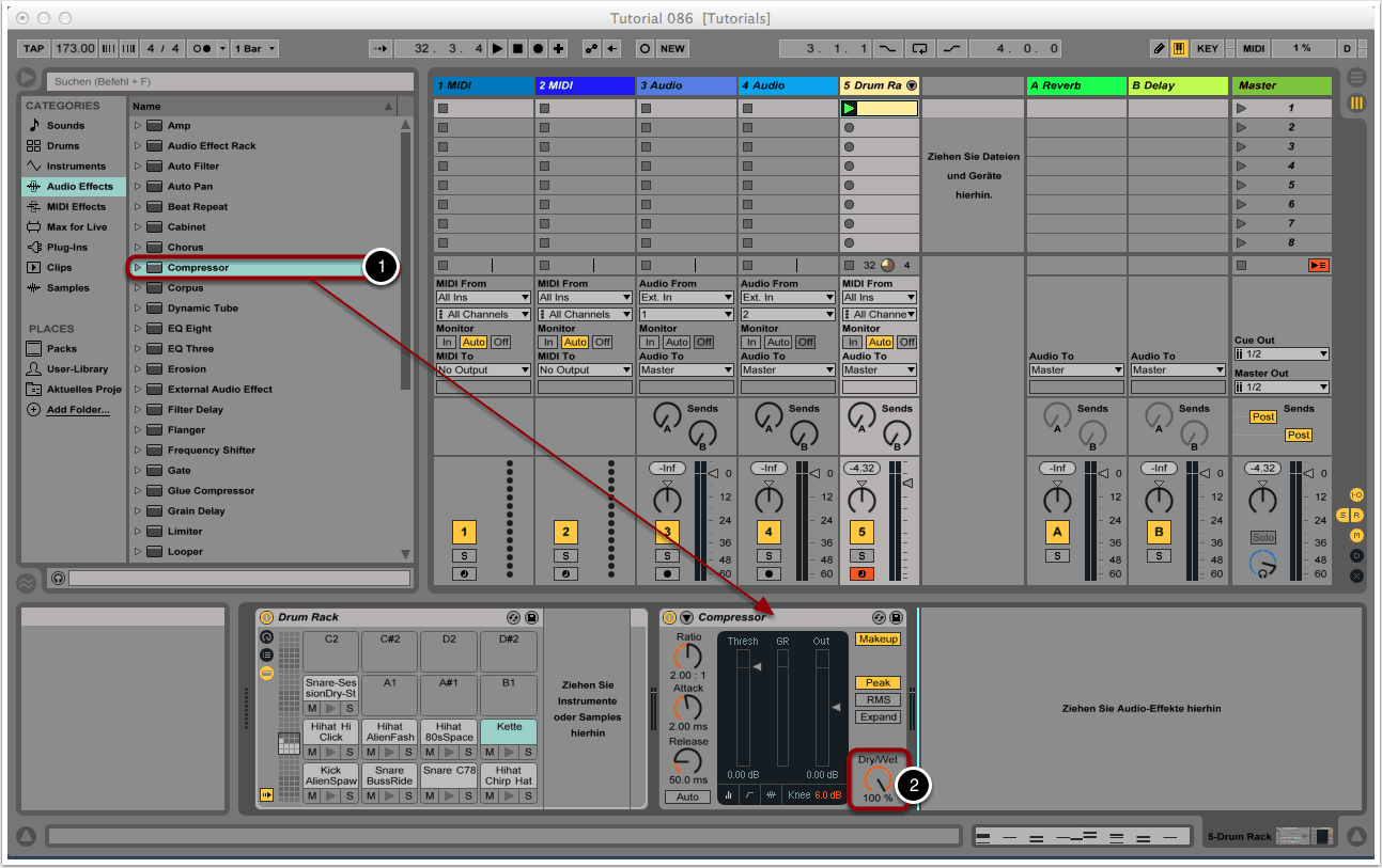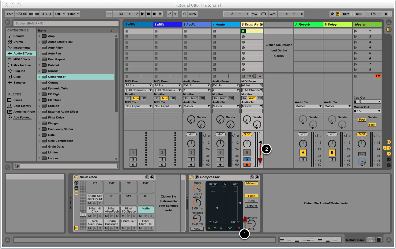 Wir wählen einen beliebigen Kompressor aus dem Audio-Effects-Menü auf der linken Seite aus und ziehen das Modul auf die Spur, auf die wir Parallel Compression anwenden wollen. Dies kann beispielsweise die Master-Spur sein oder ein Aux-Channel, der mehrerer Spuren zusammenfasst. In unserem Beispiel wenden wir das Verfahren auf eine Drum-Spur an (1).