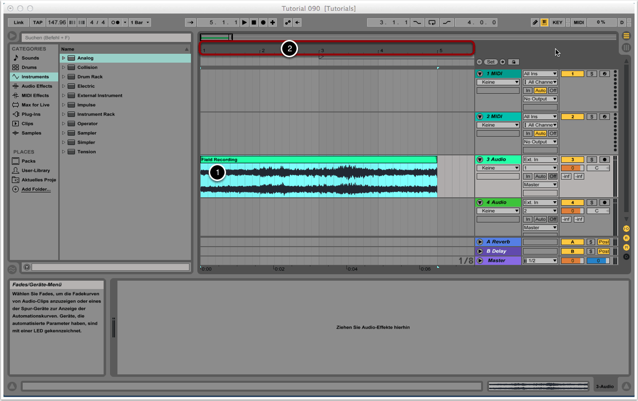 Per Drag&Drop ziehen wir die Audiodatei, die wir loopen möchten, in eine der beiden freien Audiospuren (1).