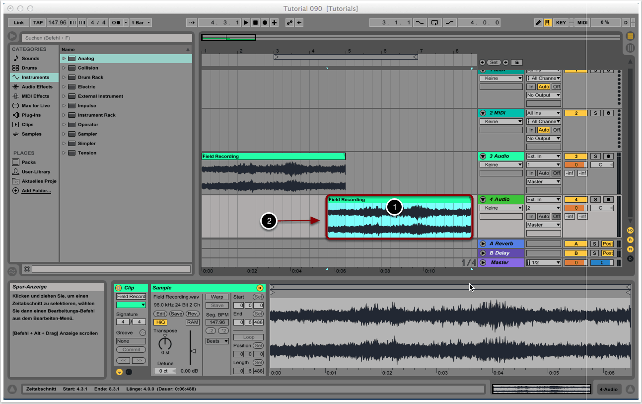 Außerdem trimmen wir die Originalregion von links her um genau die gleiche Dauer, bis diese also an genau der gleichen Stelle in der Audiofile anfängt, wo die zuvor getrimmte, kopierte Region endet (2).