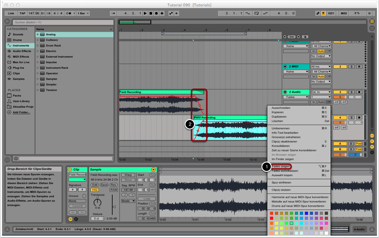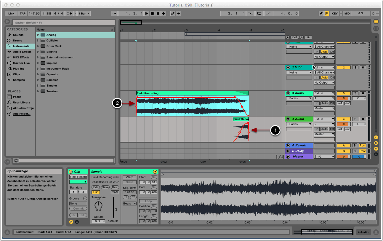 Wir erstellen einen Crossfade, indem wir einen Fade-out in der Originalfile und einen Fade-in, der in etwa genauso lange ist, in dem kopierten Bereich erzeugen. Es ist unbedingt darauf zu achten, dass der Fade-in noch vor dem Ende der Originalfile endet, da es ansonsten zu Klicks durch abrupte Lautstärkesprünge kommen kann. Vorsichtshalber sollte der Fade-in schon ein wenig vorher enden (2).