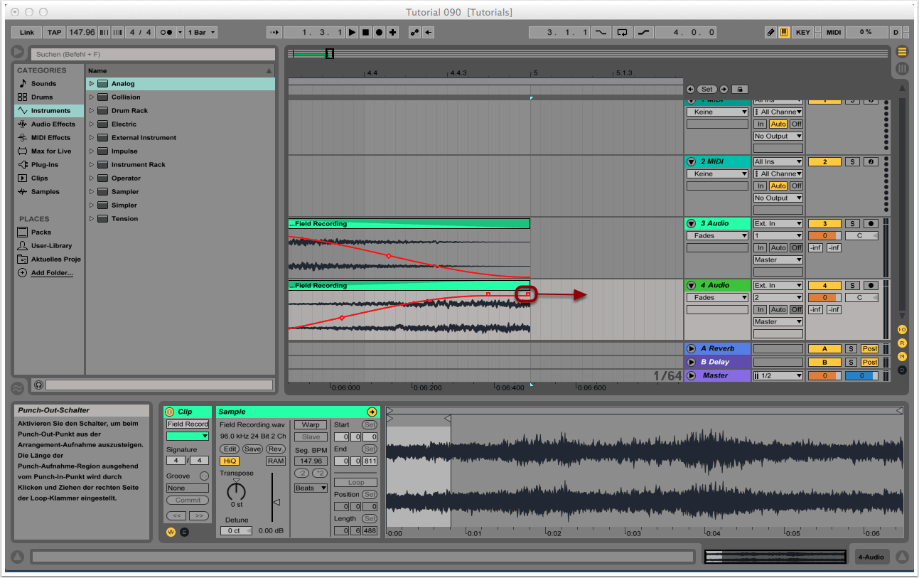 Wir zoomen zunächst extrem nahe an das Ende der Loop-Region heran. Den unerwünschten, kleinen Fade-out eliminieren wir, indem wir den letzten Fade-Stützpunkt ganz nach rechts ziehen, bis der Fade verschwindet.