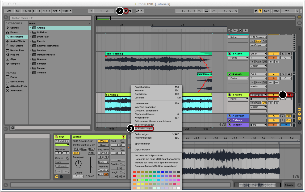 Wir können die neu erzeugte Audiodatei aufrufen, indem wir mit einem Rechtsklick auf die Wellenform in der Audiospur den Befehl “Im Finder zeigen” auswählen. Daraufhin öffnen sich der entsprechende Ordner mit allen in der Session erzeugten Audiofiles (3).