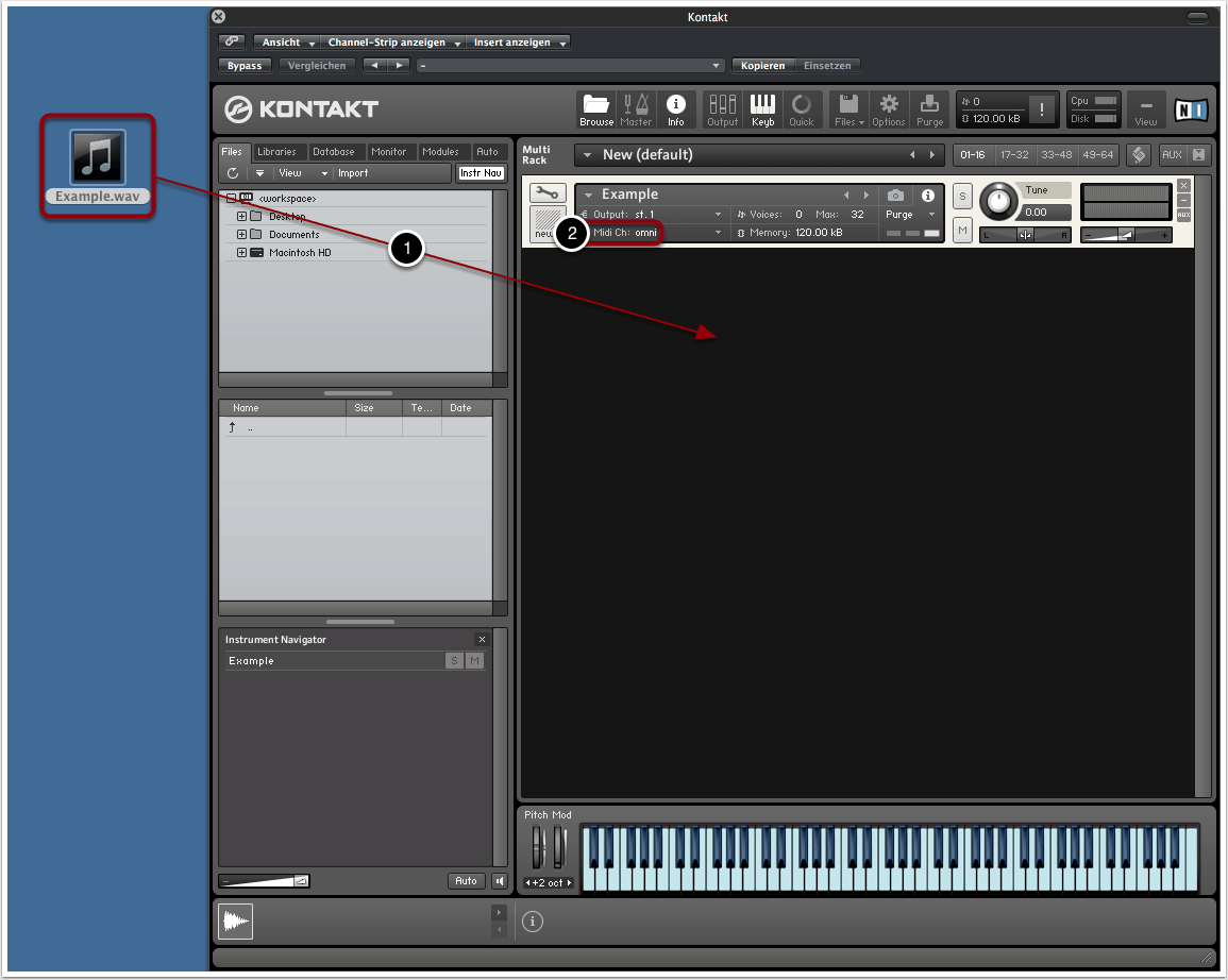 Um die Samples bequem mit dem MIDI-Keyboard anspielen zu können, stellen wir den MIDI-Channel auf “omni” (2).
