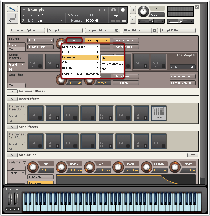 Mit einem Rechtsklick auf den Tune-Regler wählen wir “Envelopes” -> “ahdsr” aus. Alternativ können wir den Pitch beispielsweise auch von einem LFO modulieren lassen oder mit einem externen MIDI-Controller ansteuern.