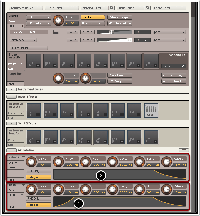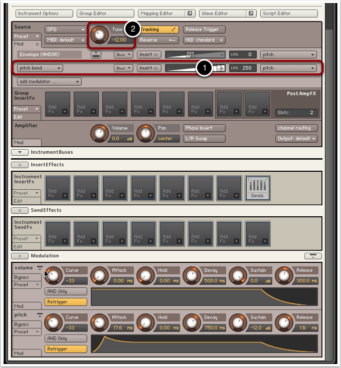 Den Verlauf der Tonhöhe können wir jetzt durch die Anpassung des neu erstellten Hüllkurven-Modulators festlegen. In unserem Beispiel steigt der Pitch bei jedem Anspielen des Samples innerhalb einer Sekunde von -12 Halbtönen auf die Ausgangstonhöhe an. Der Release der Tonhöhe dauert 5 Sekunden mit einem Tonhöhenverlust von erneut einer Oktave (1).