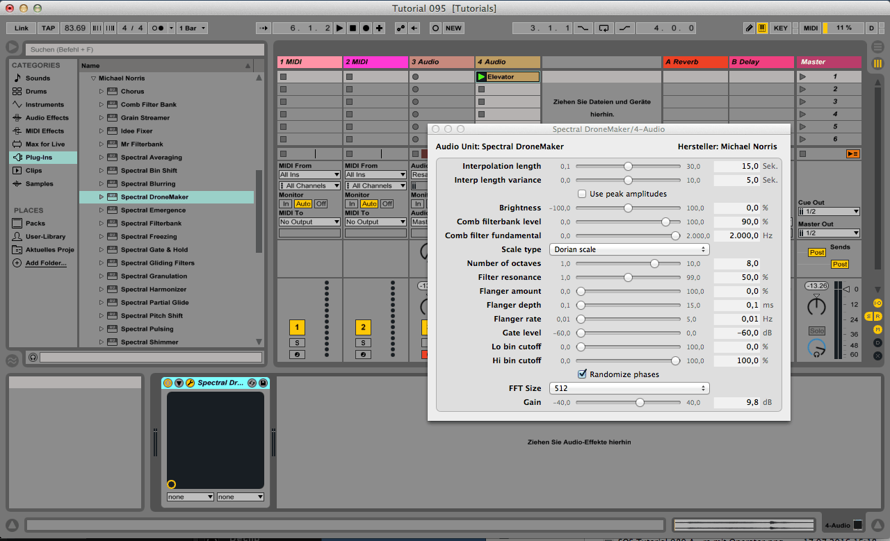 Sofern bei der Installation alles richtig gemacht wurde, finden wir Spectral Drone Maker in der Rubrik Plug-ins -> Michael Norris. Neben dem Drone Maker gibt es noch eine ganze Reihe weiterer Tools, die es sich ebenfalls lohnt, auszuprobieren.
