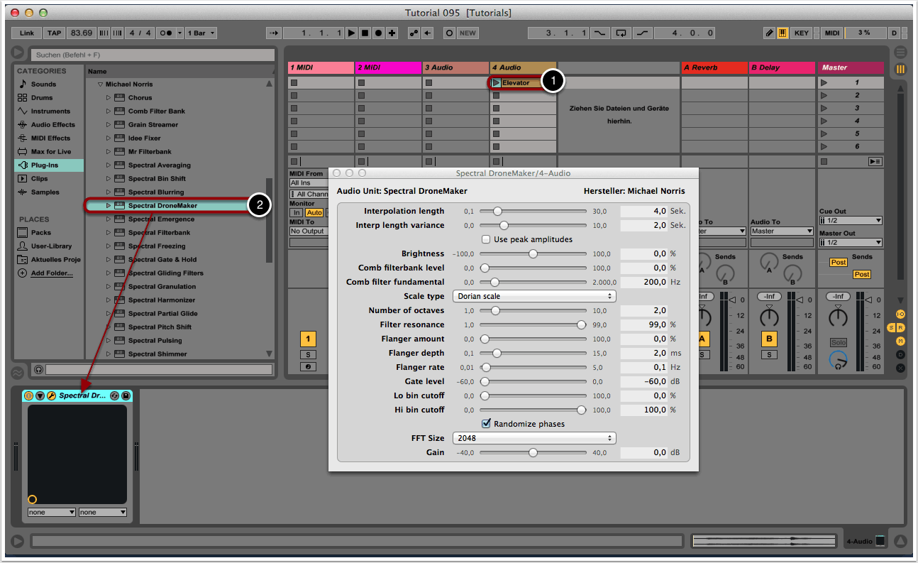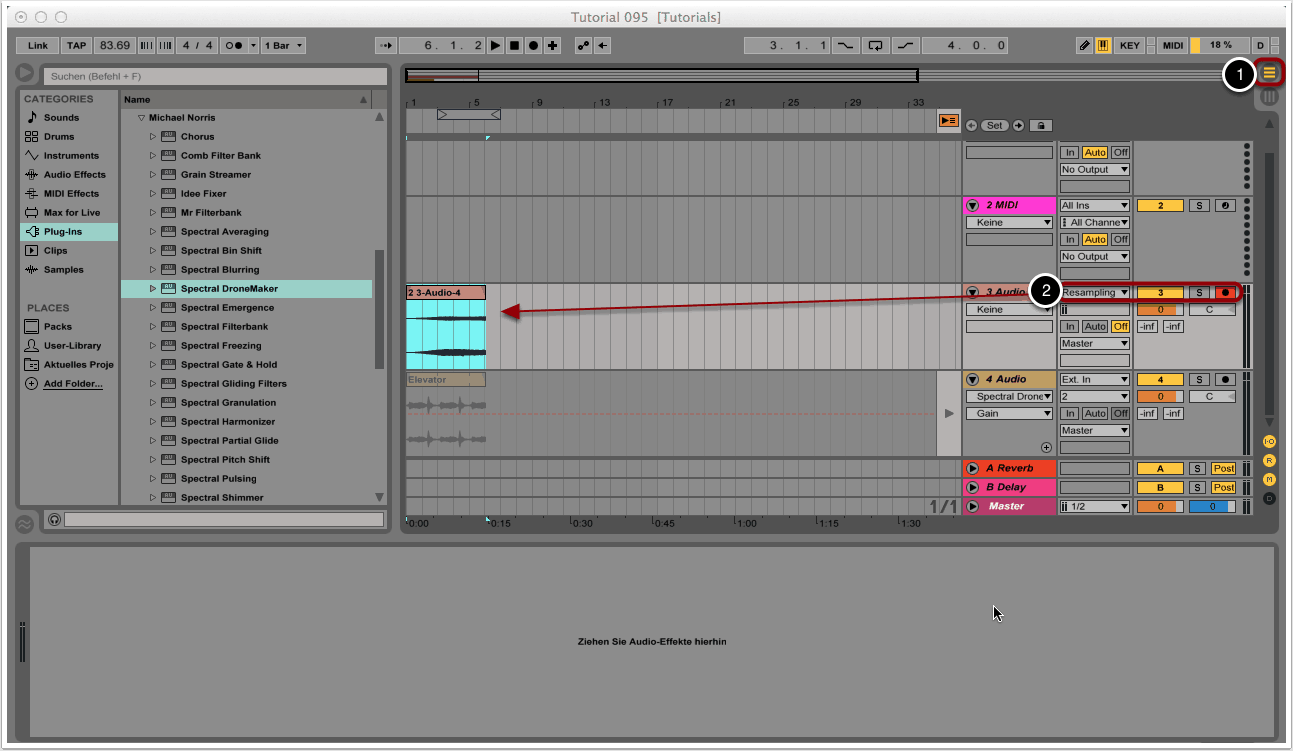 In Ableton Live ziehen wir den Effekt per Drag&Drop auf die Audiospur, in der sich auch unser Quellsample befindet (2).
