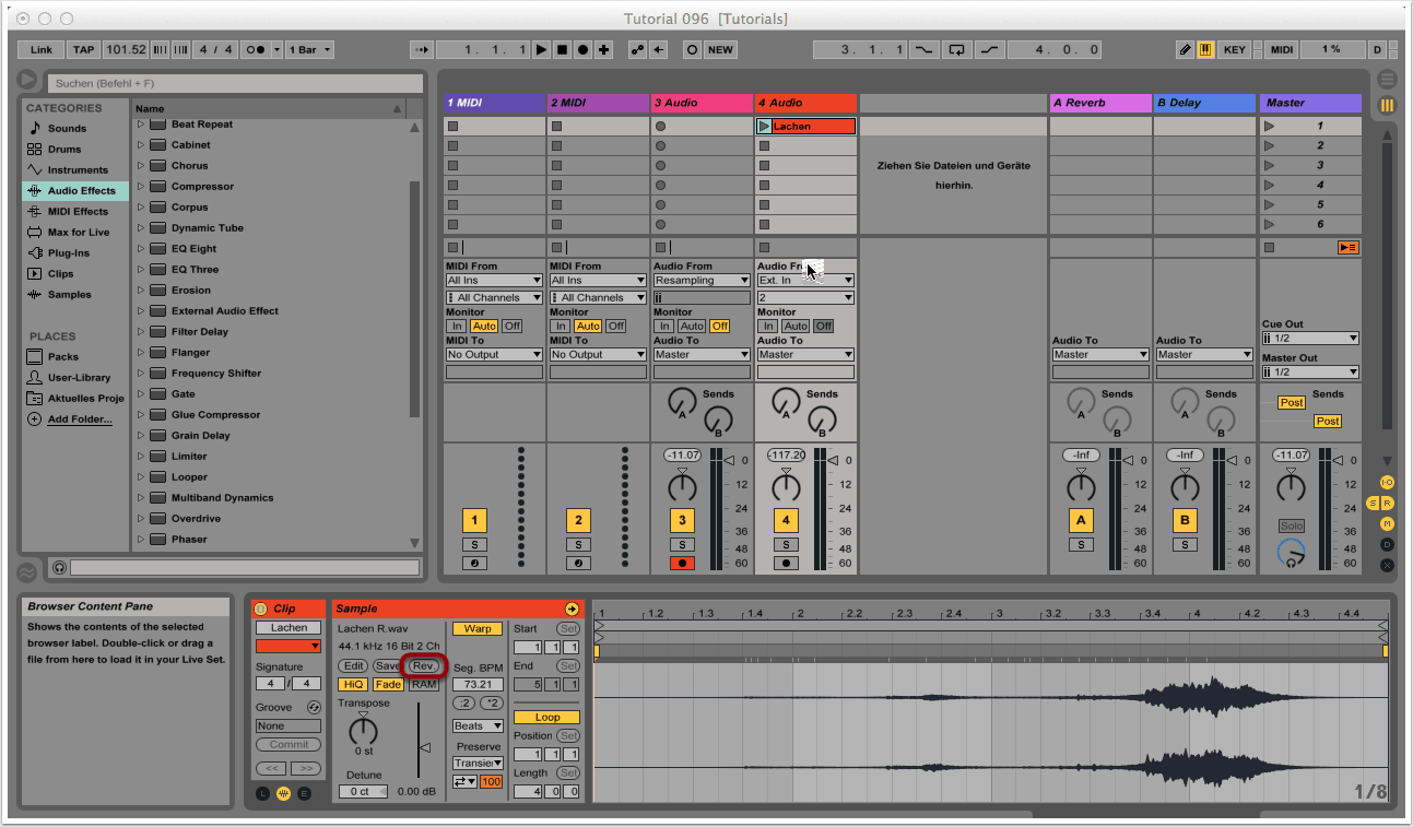 Durch einen Doppelklick auf den neu erstellten Slot öffnen wir den Sample-Editor. Über den kleinen Button mit der Aufschrift “Rev.” kehren wir das Sample um. Beim Abspielen sollte das Soundfile jetzt rückwärts abgespielt werden.
