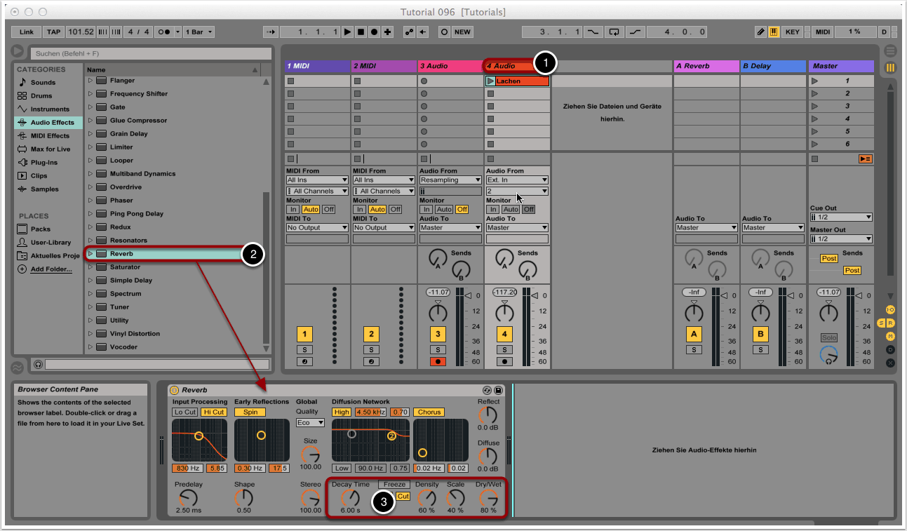 Wir bringen die Decay-Time auf etwa 6 Sekunden und erhöhen den Dry-/Wet-Anteil auf ungefähr 80% (3).