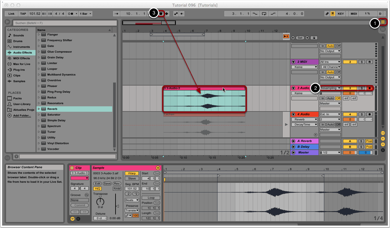 Wir aktivieren den Main-Record-Button, spielen den Clip mit dem Quellsample ab und zeichnen so das Sample mit dem Nachhall auf (3).