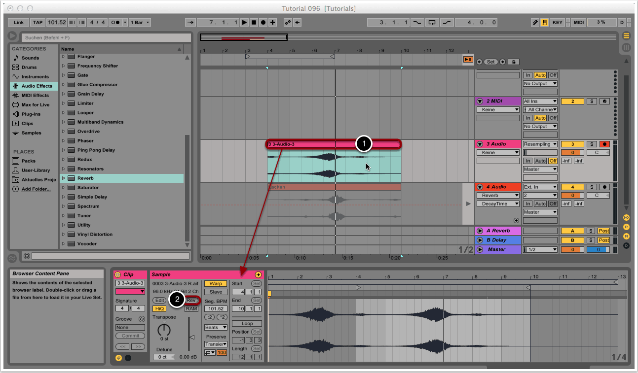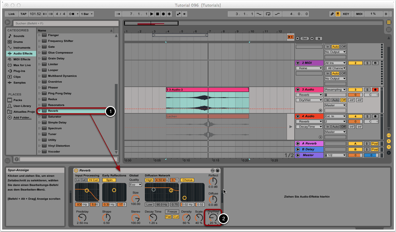 Um Dry- und Wet-Signal noch etwas mehr miteinander zu verbinden, wählen wir erneut “Reverb” aus dem Audio-Effects-Menü aus und ziehen das Modul auf die Audiospur mit dem neu erstellten File (1).