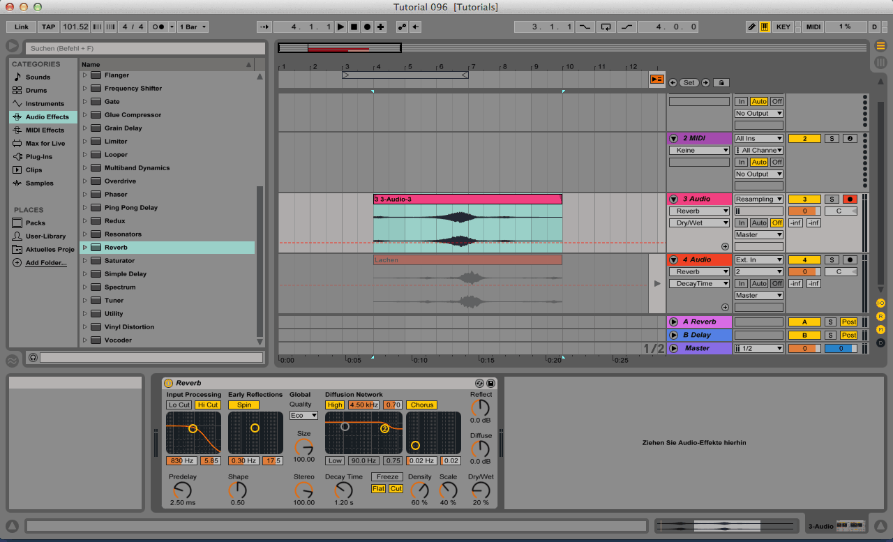 Um Dry- und Wet-Signal noch etwas mehr miteinander zu verbinden, wählen wir erneut “Reverb” aus dem Audio-Effects-Menü aus und ziehen das Modul auf die Audiospur mit dem neu erstellten File (1).