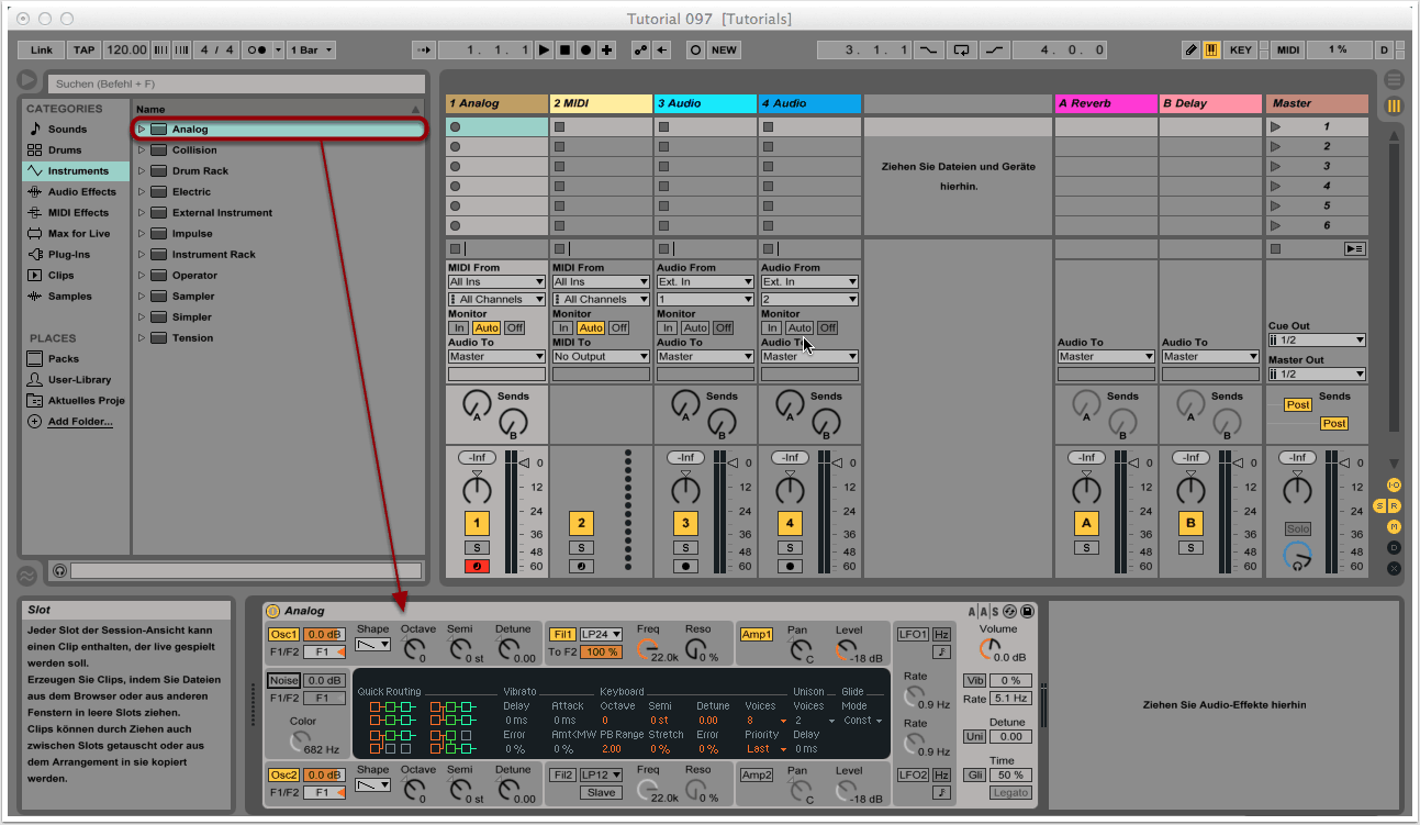 Im Instrumenten-Ordner wählen wir Analog aus und ziehen den Synthesizer per Drag&Drop nach unten in die leere, graue Fläche.