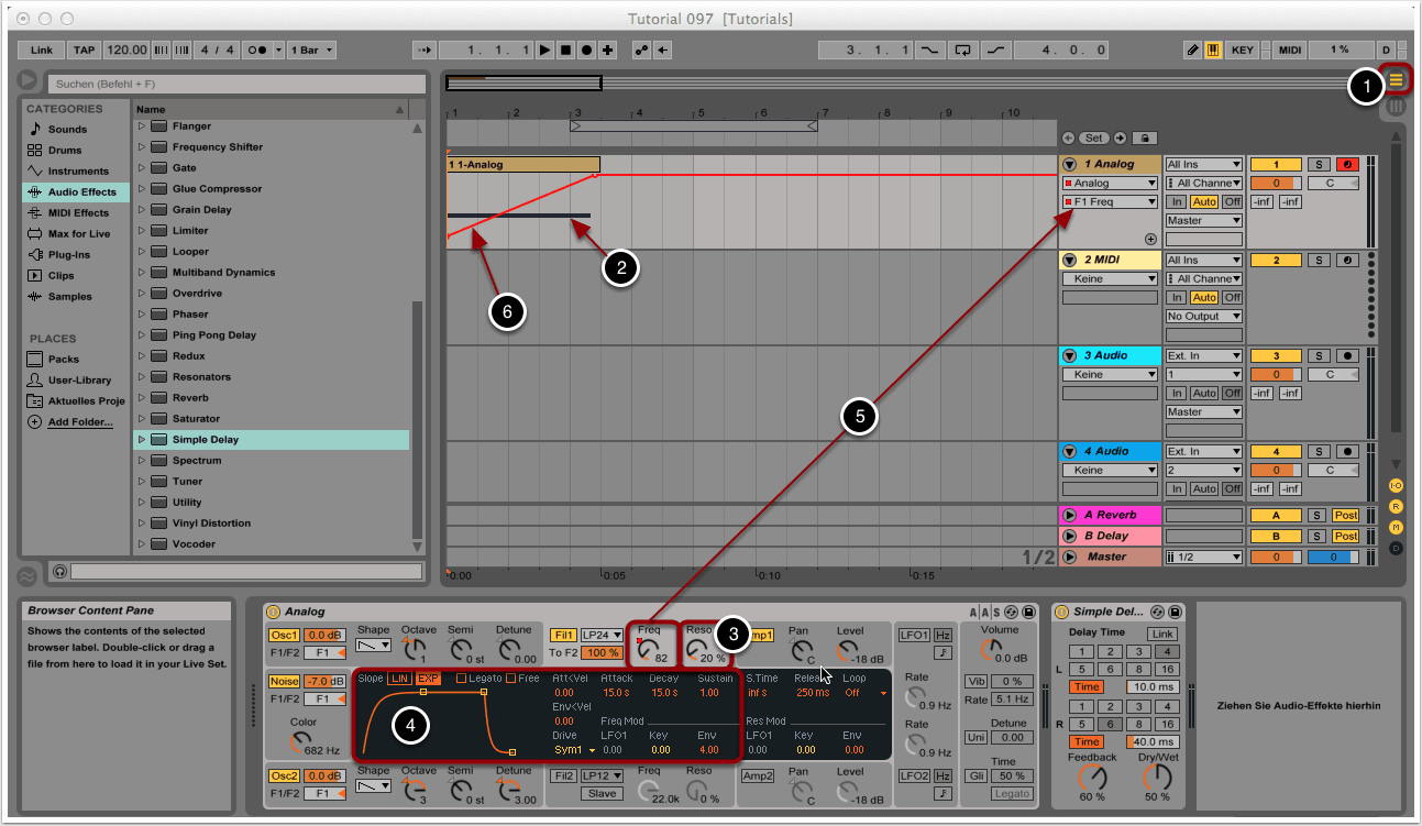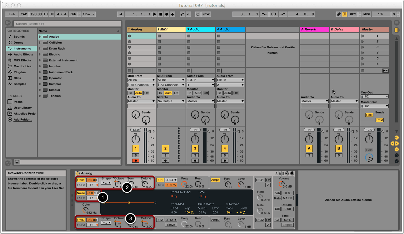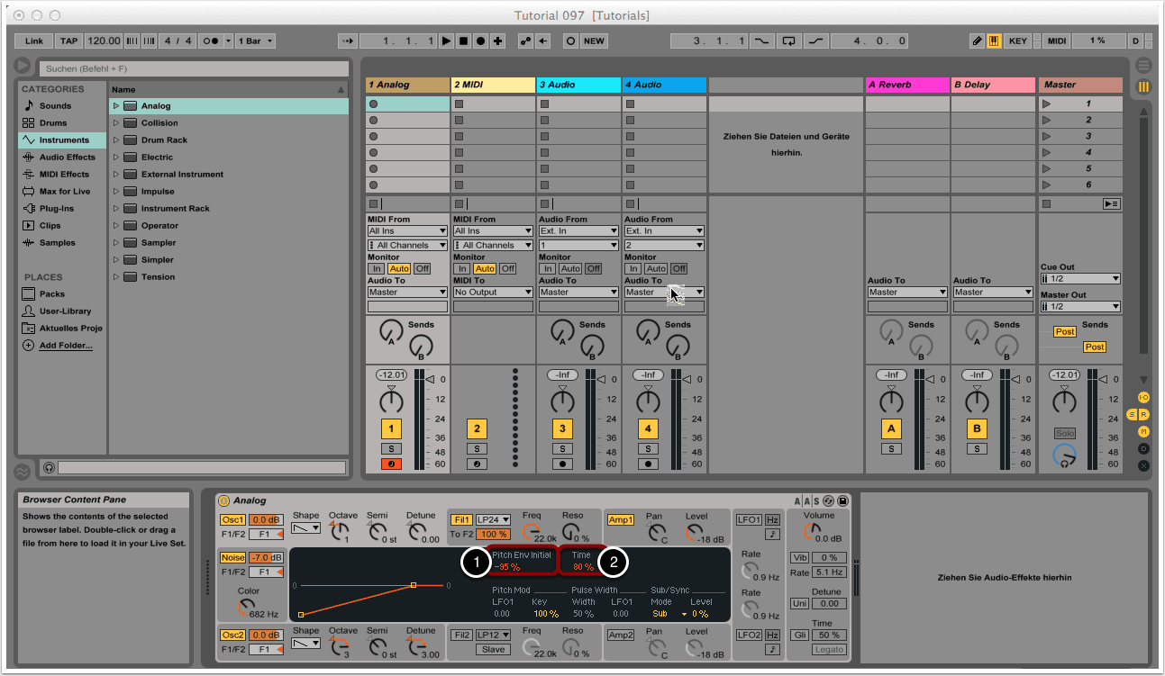 Wir rufen erneut Analog auf und erhöhen die Resonanz des Filters auf 20% (3).