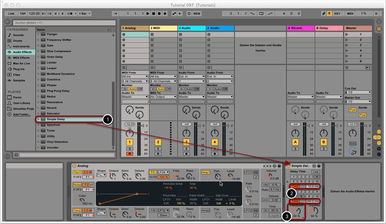 Für mehr “Fatness” wählen wir “Simple Delay” aus dem Audio-Effects-Menü und ziehen das Modul per Drag&Drop rechts neben den Synthesizer (1).