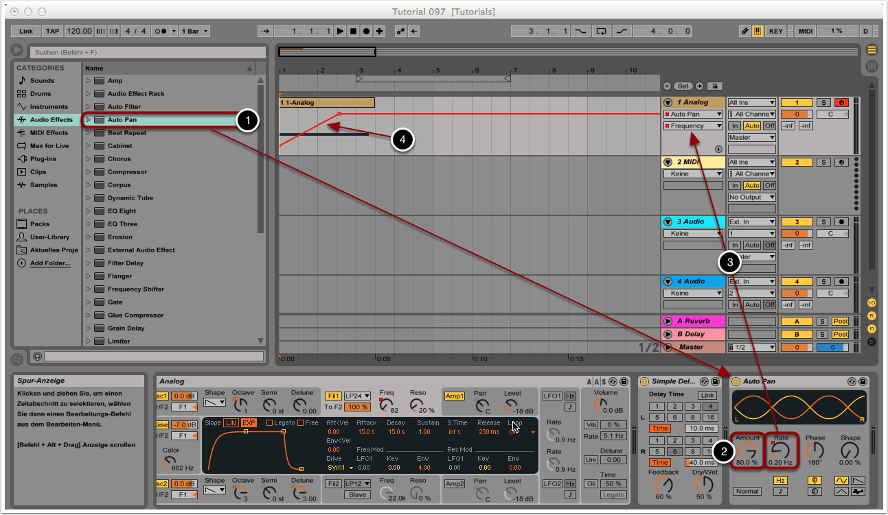 Durch einen einfachen Mausklick wählen wir den Rate-Regler von Auto Pan an. Wie im Schritt zuvor wird dadurch der Parameter dem Automations-Menü zugewiesen (3).