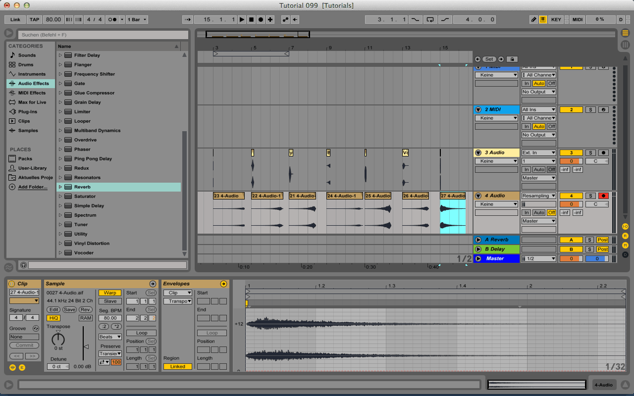 Eine lange Hallfahne, die wir mit einem Reverb-Effekt erzeugen und invertieren, bildet den Kern des Processings und ist Gegenstand des ersten Teils des Doppel-Tutorials. In Tutorial 100 werden wir die invertierten Hallfahnen durch weiteres Processing in kurze Riser und Lead-Ins umwandeln. Wir verwenden hierzu ausschließlich die Effekt- und Audio-Racks von Ableton Live.