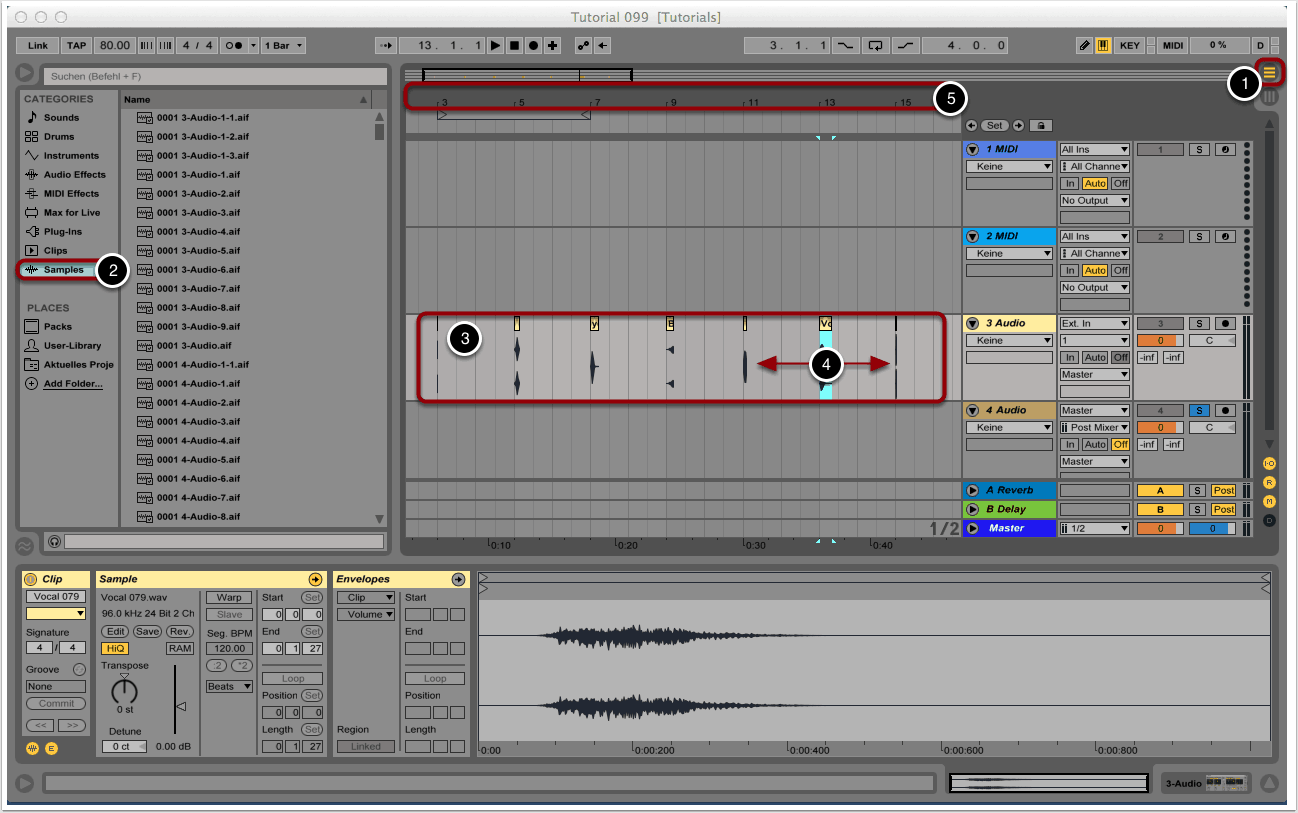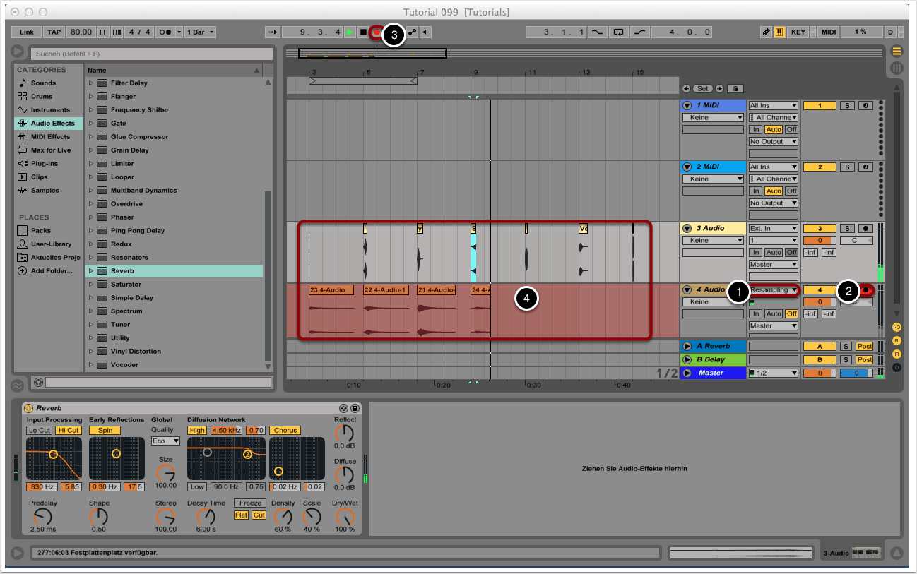 Es ist sinnvoll, pro Sample eine neue Aufnahme zu erstellen, so dass die Hallfahnen für die nachfolgenden Schritte bereits als separate Audiofiles vorliegen (4).