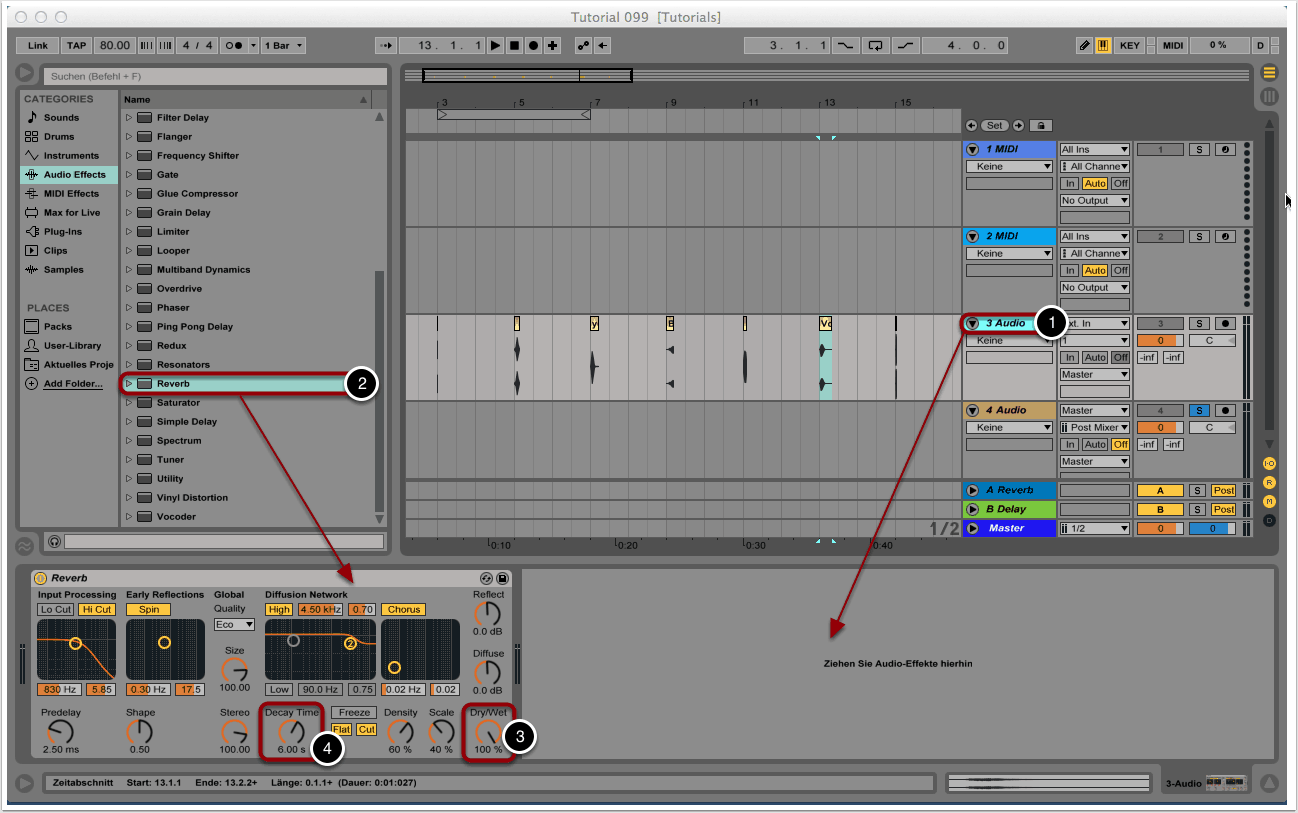Wir begeben uns in das Audio-Effects-Menü und ziehen das Reverb-Modul per Drag&Drop in den grauen Bereich (2).