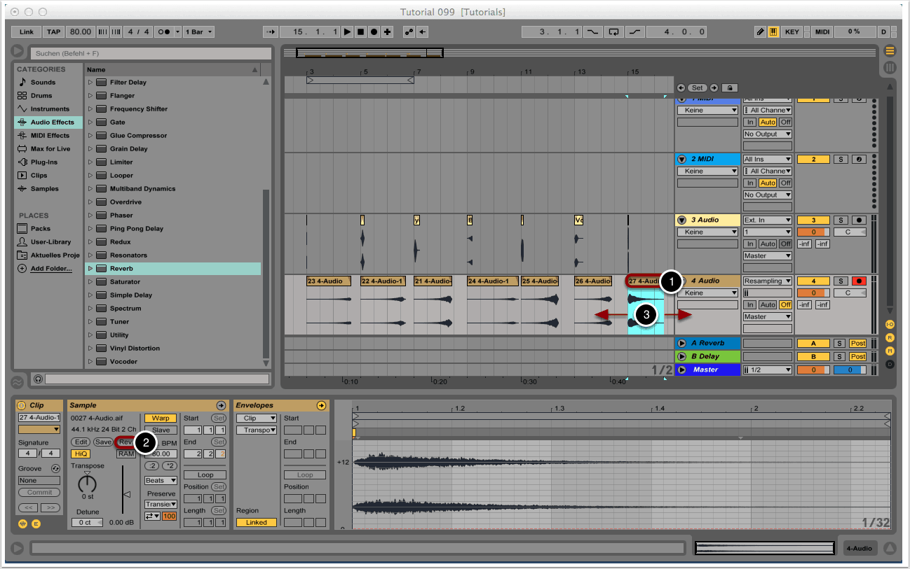Es ist wichtig darauf zu achten, einen großen Abstand zwischen den Samples einzuhalten, so dass der Reverb später ausklingen kann, bevor das nächste Samples abgespielt wird (4).