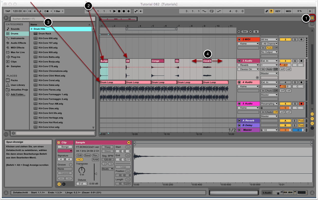 Wir erstellen in Ableton Live ein neues Projekt und wechseln zur Arrangement-Ansicht (1).
