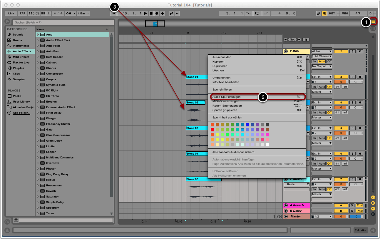 Mit einem Rechtsklick auf die Titelzeile einer beliebigen Spur oder durch den Befehl Cmd+T erzeugen wir 4-5 neue Audiospuren (2).