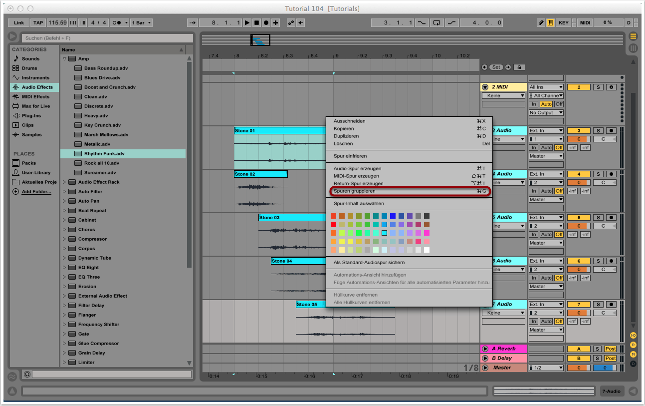 Um die Spuren mit unseren Quellsamples zu einer Gruppe zusammenzufassen, wählen wir alle Spuren an und aktivieren mit einem Rechtsklick die Option “Spuren gruppieren” (s. auch SOS Tutorial 104).