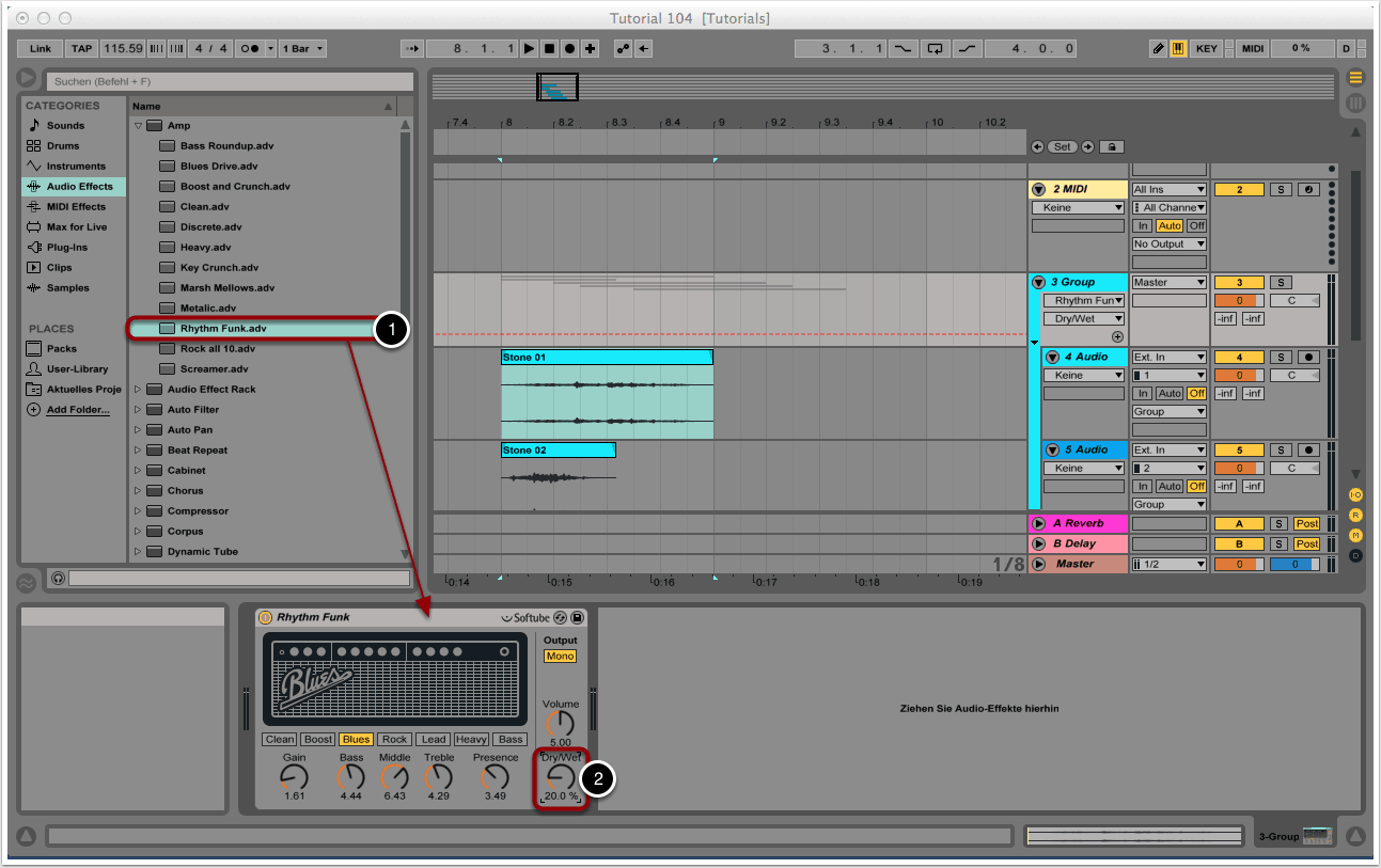 Aus dem Audio-Effects-Menü wählen wir das Amp-Preset “Rhythm Funk” aus und ziehen es per Drag&Drop auf die neu erstellte Gruppen-Spur (1).
