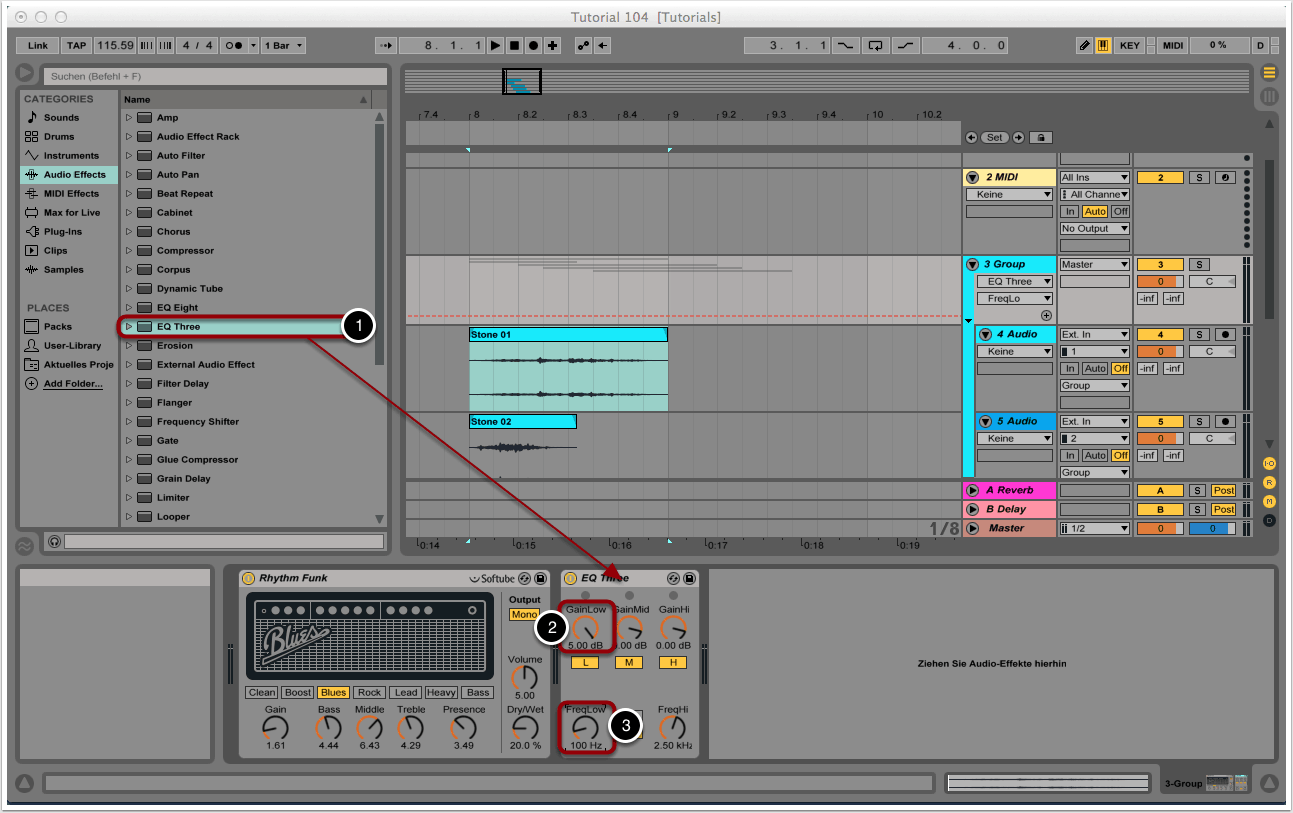 Wir wählen “EQ Three” aus dem Effects-Menü aus und ziehen das Modul neben den virtuellen Gitarrenverstärker (1).