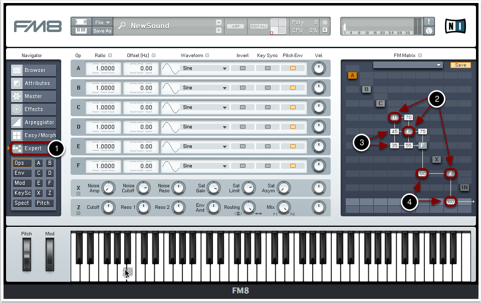 Während der Output von Oszillator F zunächst noch direkt an den Output gesendet wird, dienen die anderen Oszillatoren D und E lediglich als Frequenzmodulatoren. Da wir sozusagen das “Produkt” der aktiven Oszillatoren allerdings nicht direkt an den Master-Output senden, sondern ein Filter zwischenschalten wollen, weisen wir das Routing dem Filter Z zu (4).
