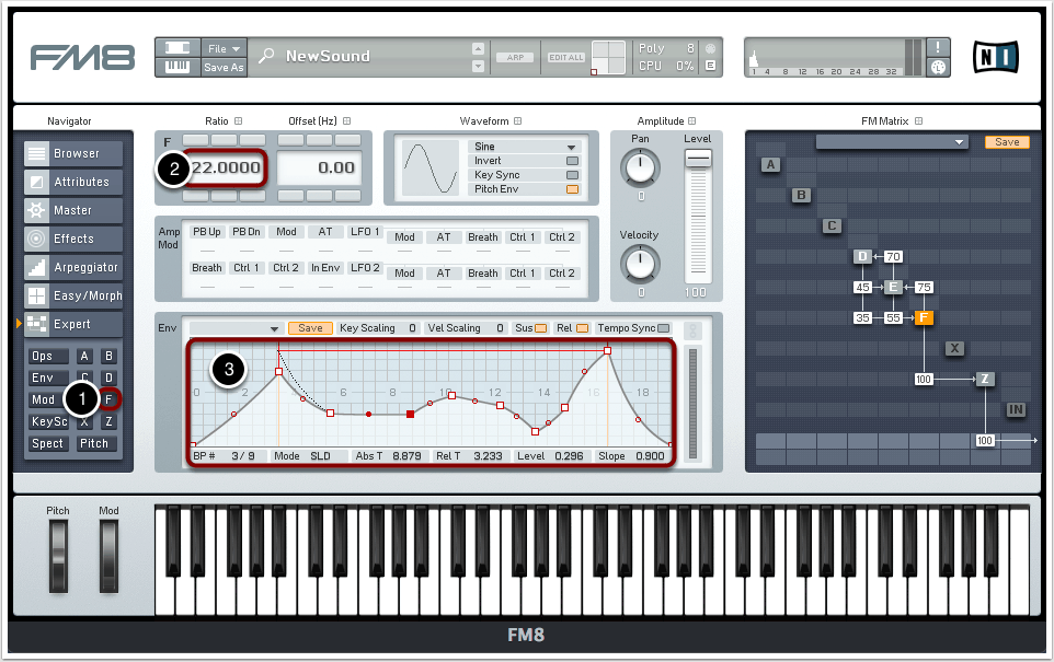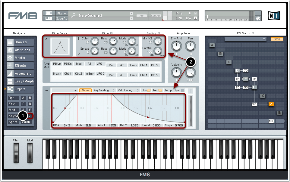 Über die Buchstaben auf der linken Seite können wir im Expert-Menü die Hüllkurve, die Wellenform und weitere Eigenschaften der Oszillatoren bestimmen. Zunächst rufen wir die Settings für Oszillator F auf (1).
