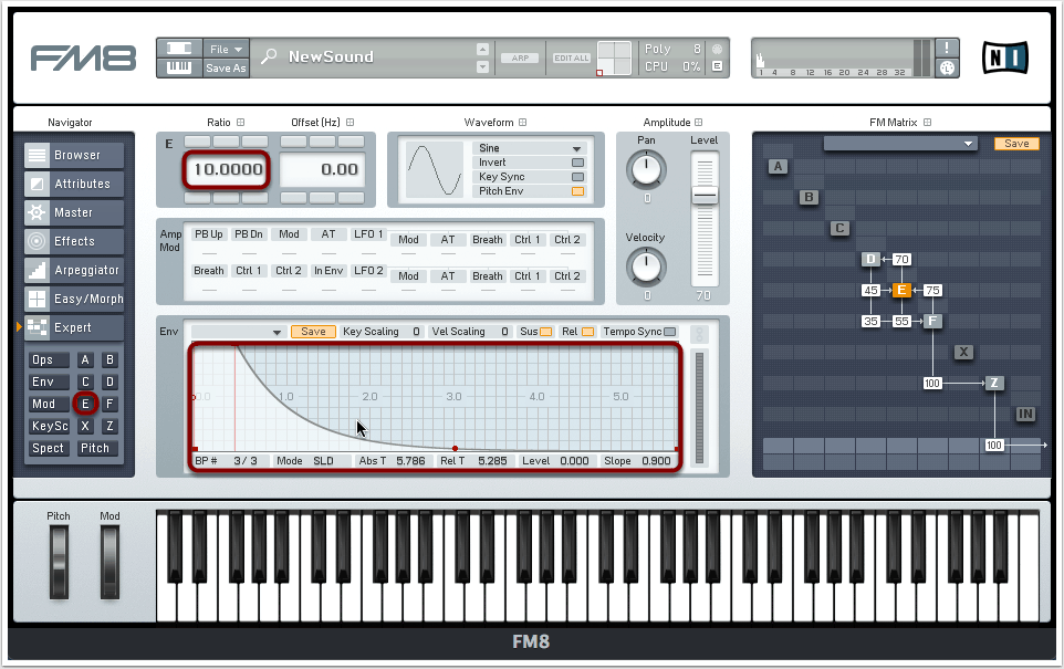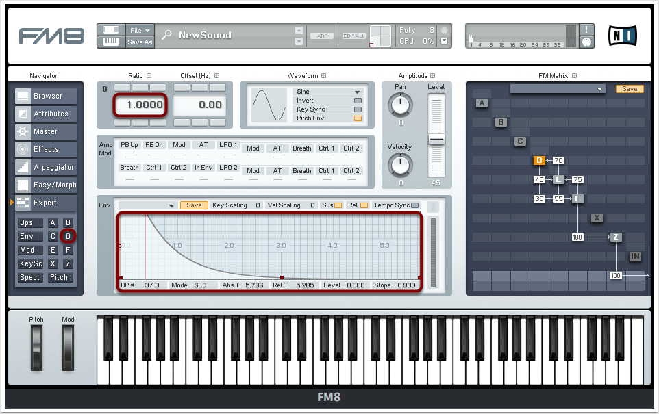 Die Zahlenwerte unmittelbar neben den Oszillatoren entsprechen dem Grad der Frequenzmodulation. Je höher dieser Wert ist, umso stärker fällt die Modulation aus. Die Werte aus der Abbildung müssen nicht zwingend exakt übernommen werden, doch sollte berücksichtigt werden, dass auch nur minimale Änderungen dieser Werte zu durchaus drastischen Veränderungen des Sounds führen können!